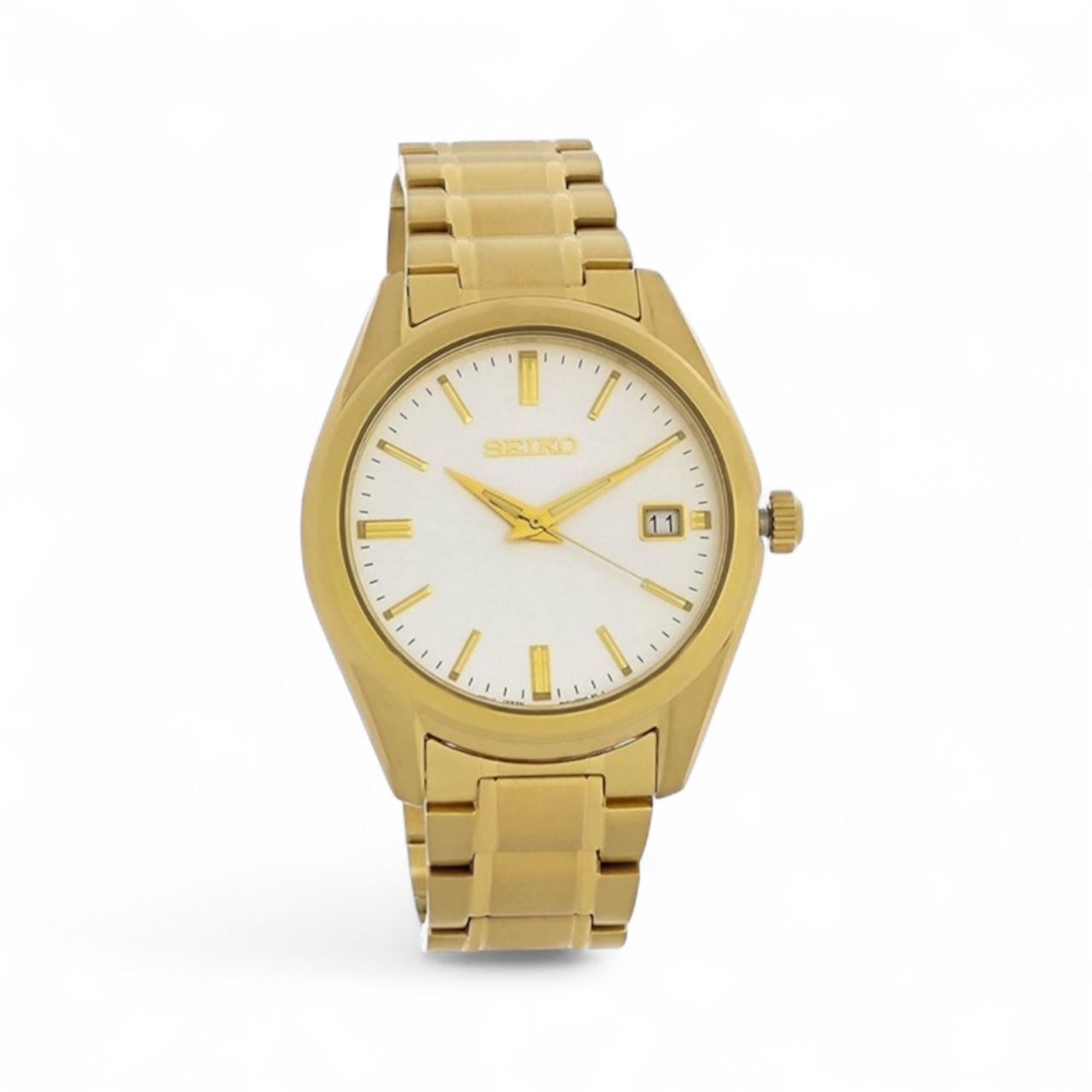 Essentials CollectionWhite dialDate calendarLumiBrite handsSapphire crystalCase diameter: 40.2 mmGold-tone stainless steel case and braceletWater-resistant to 10 bar, 100 meters (330 feet)Caliber 6N52