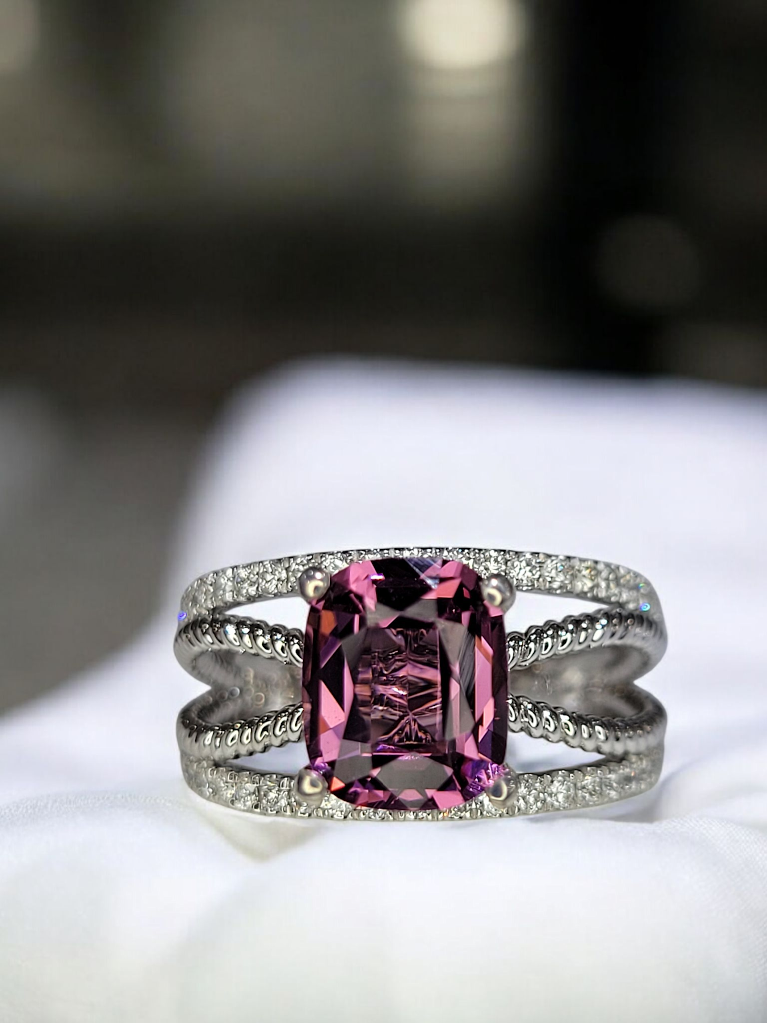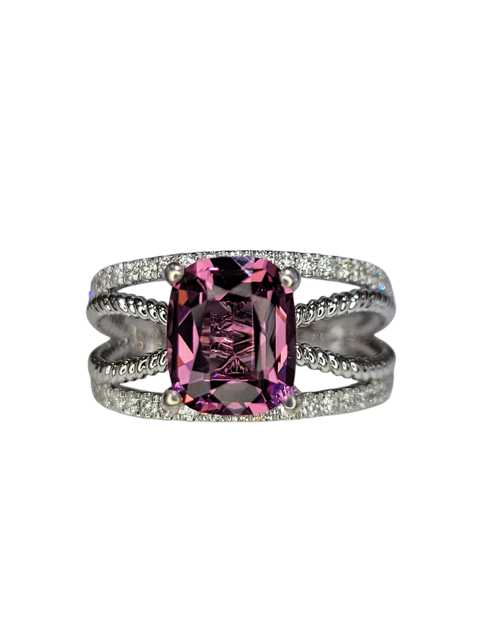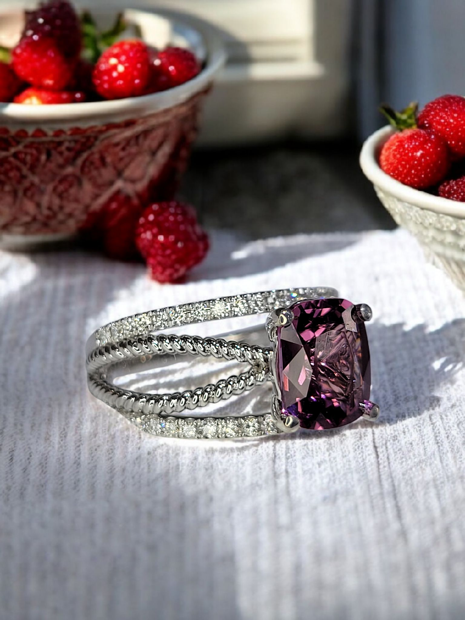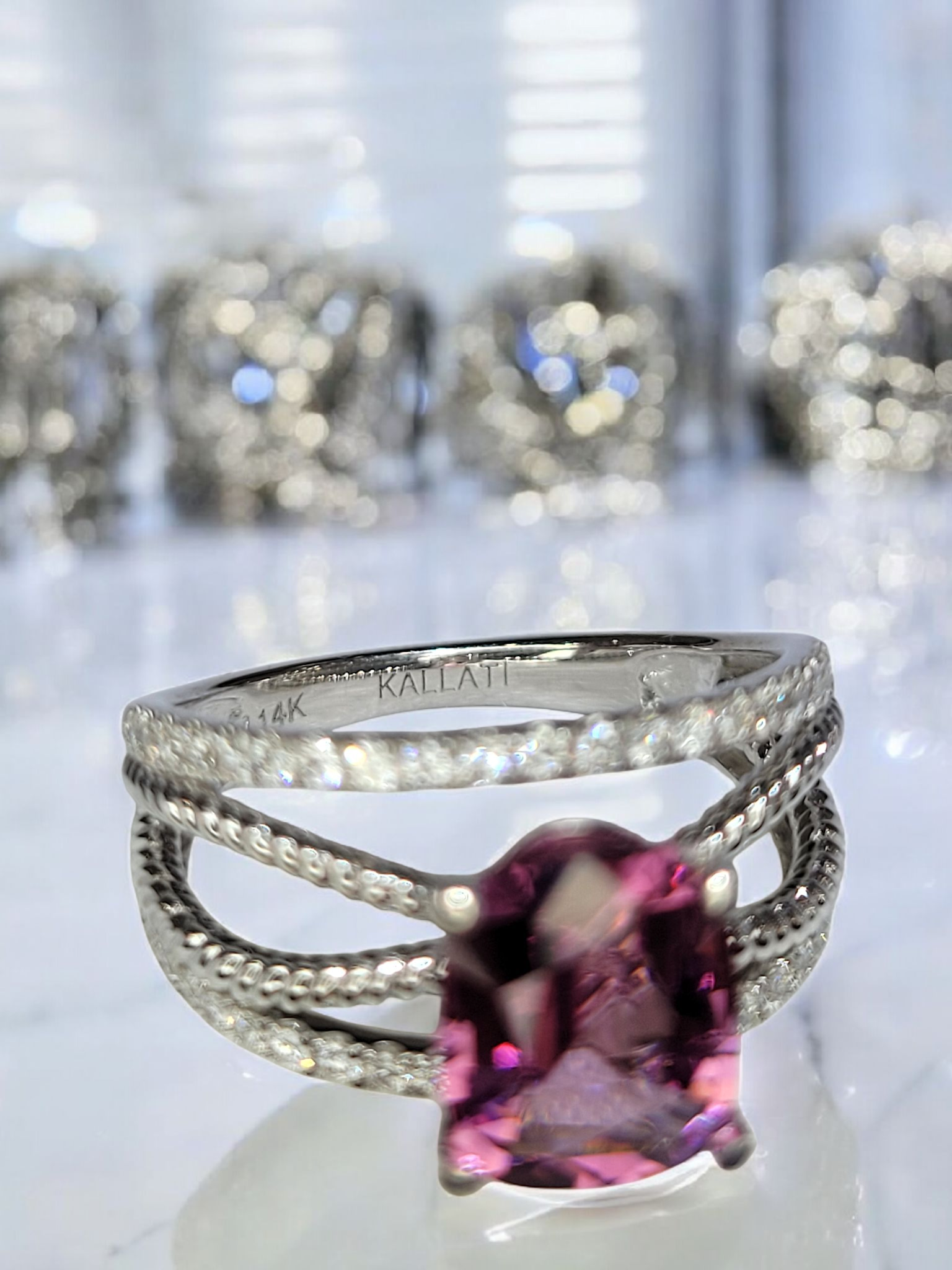 (Z) 14K 2.39TG .75DIA , 14K WHITE GOLD RING BY DESIGNER KALLATI, 2.39CT RARE TANGA GARNET WITH NO TREATMENTS, .75CT IN DIAMONDS, CUSHION CUT CENTER 8.9MM X 7.25MM X 4.15MM