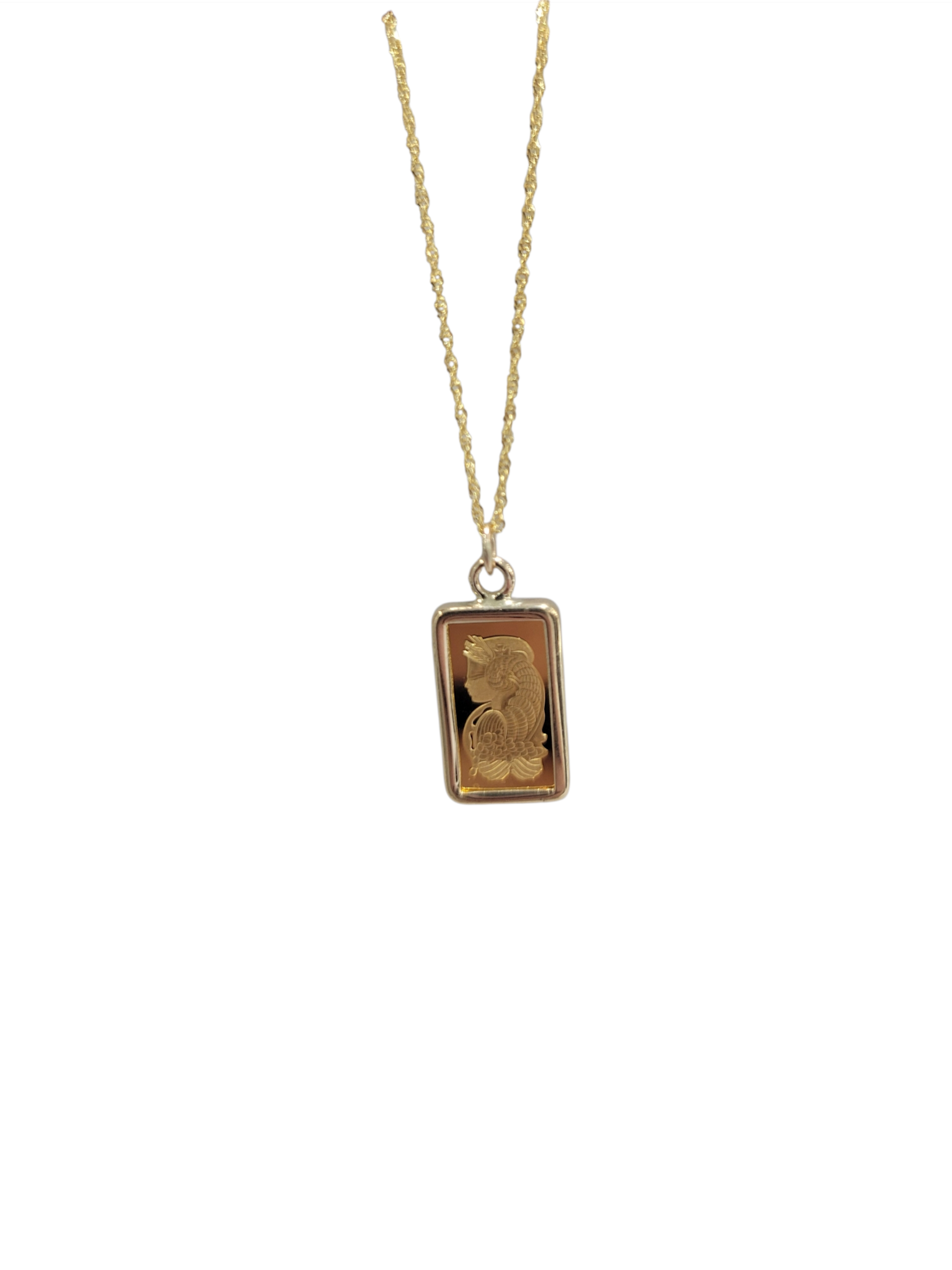 (Z) 14K/24K 1GRAM SWIIS PAMP , 14K YELLOW GOLD SINGAPORE CHAIN WITH 14K BEZEL, 24K 1GRAM SWIIS PAMP BAR WITH GREEK GODDESS FORTUNA